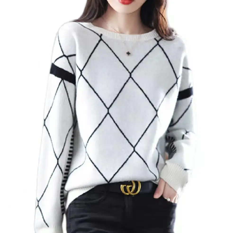 Женский свитер в клетку с круглым вырезом, теплый джемпер на осень и зиму, мягкий женский джемпер с верхом, вязаная одежда