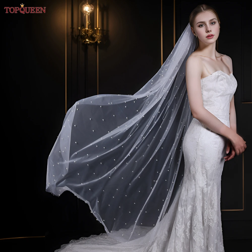 Фата свадебная TOPQUEEN V05 с жемчугом, мягкая Фата для невесты, Длина фаты с гребнем, свадебные аксессуары
