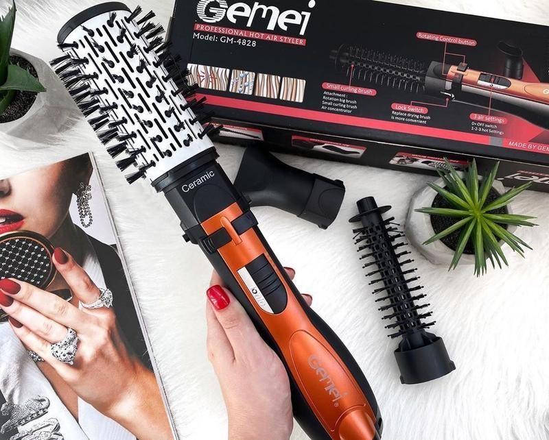 Стайлер Gemei GM-4828 - это многофункциональный прибор для красоты Ваших волос, он позволит создавать различные неотразимые образы каждый день. GM-4828 - это фен с тремя различными насадками, с помощью которых можно создавать множество видов причесок: кудри - мелкие и крупные, объем, брашинг, любые сложные укладки, все, на что хватит фантазии. Стайлер бережно сушит волосы, не наносит вреда их структуре и, благодаря автоматически вращающимся насадкам, обеспечивает эффективную стойкую укладку. Gemei GM-4828 подойдет для любого типа и длины волос и станет незаменимым помощником для Вашей красоты каждый день.