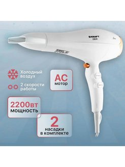 Фен Kraft KF-HD228ADW 2.2 кВт, режимов: 3, насадок: 2, белый, KF-HD228ADW