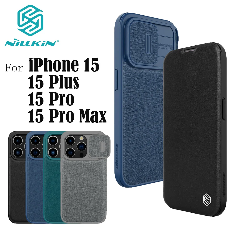 Флип-чехол для iPhone 15 Pro /Pro Max Nillkin Qin Pro, кожаный тканевый чехол-книжка с кармашком для карт и сдвижной камерой для iPhone 15 /15 Plus