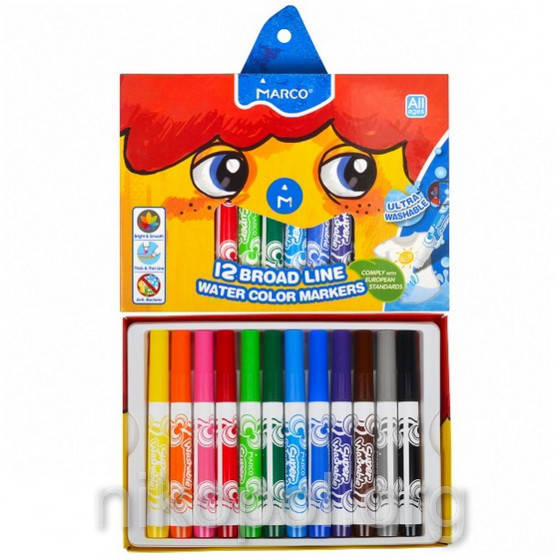 Набор цветных фломастеров MARCO JUMBO 1632-12CB из 12 цветов. Пластиковый корпус с узорами, легко отмываются с рук и одежды. Размер 14,5x1,5см., толщина острия стержня 3,5мм., на водной основе. Утолщенный корпус облегчает удержание фломастера малышом.