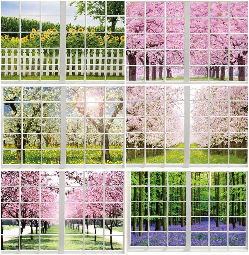 Фон для фотосъемки с изображением весенних цветов и окон пейзажа