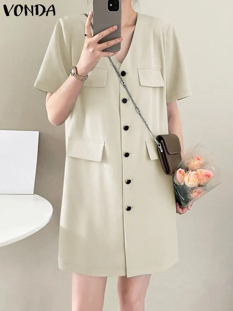 Women Solid Color Dress 2024 Fashion Short Sleeve Sundress VONDA Summer V Neck Party Dress Beach Holiday Dress Femininas Baggy