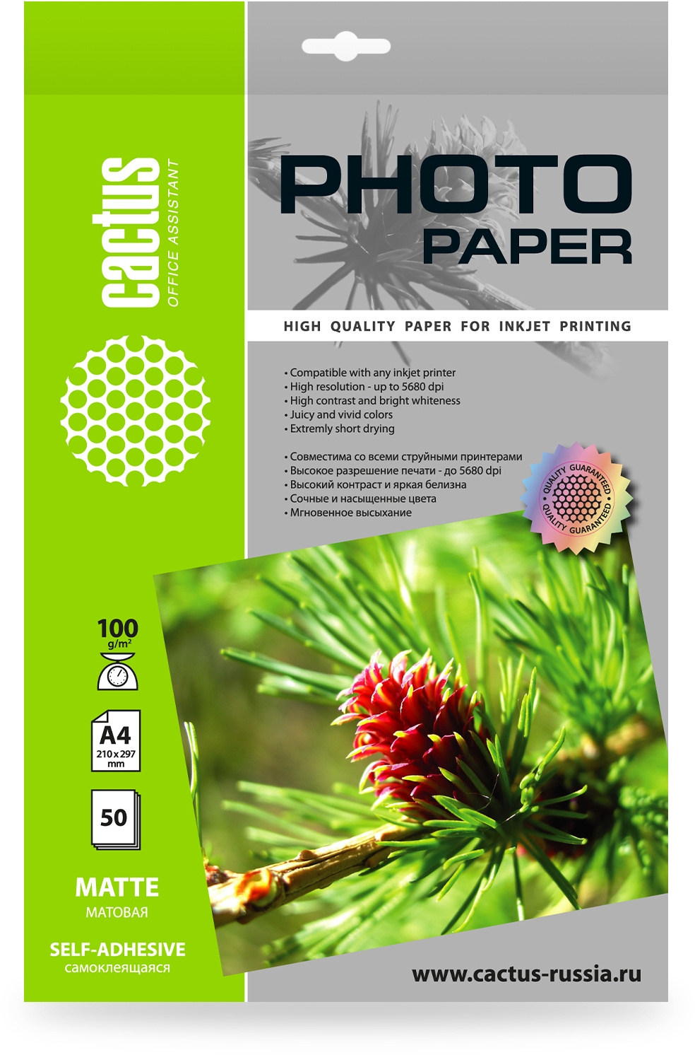 Фотобумага A4 100 г/м² матовая, 50 листов, самоклеящаяся, Cactus Photo Paper CS-MSA410050 для струйной печати