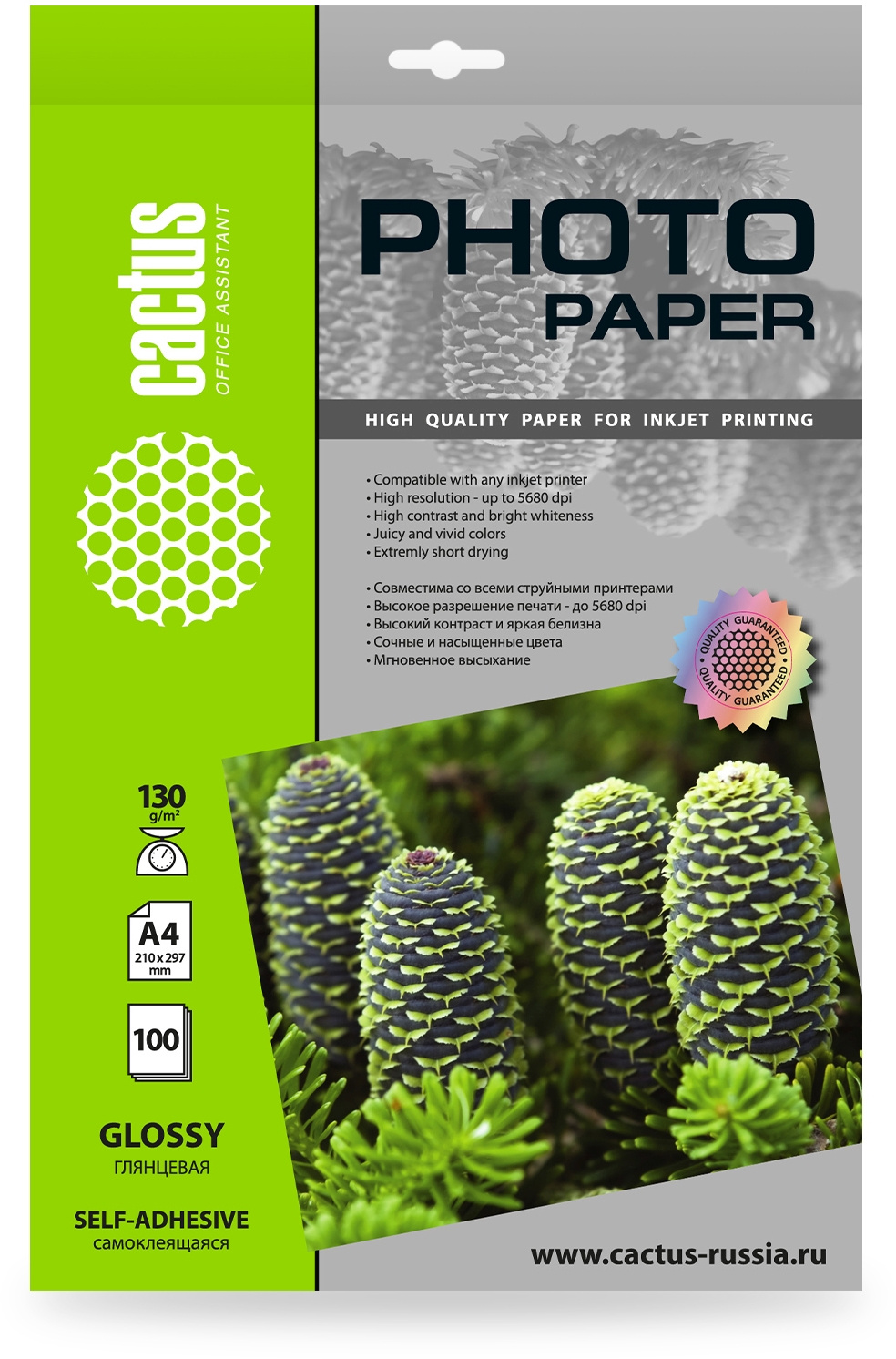 Фотобумага A4 130 г/м² глянцевая, 100 листов, самоклеящаяся, Cactus CS-GSA4130100 для струйной печати