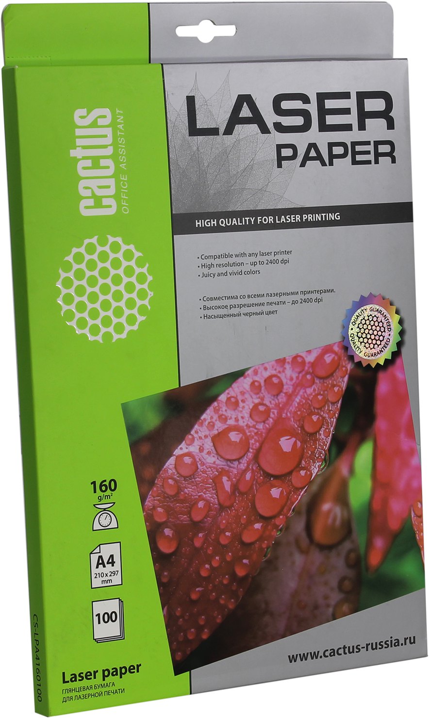 Фотобумага A4 160 г/м² глянцевая, 100 листов, односторонняя, Cactus Laser Paper CS-LPA4160100 для лазерной печати, Белый