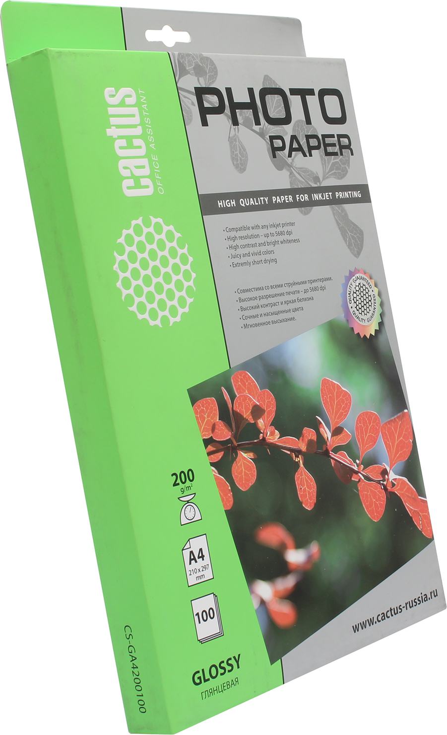 Фотобумага A4 200 г/м² глянцевая, 100 листов, односторонняя, Cactus Standard CS-GA4200100 для струйной печати, Белый