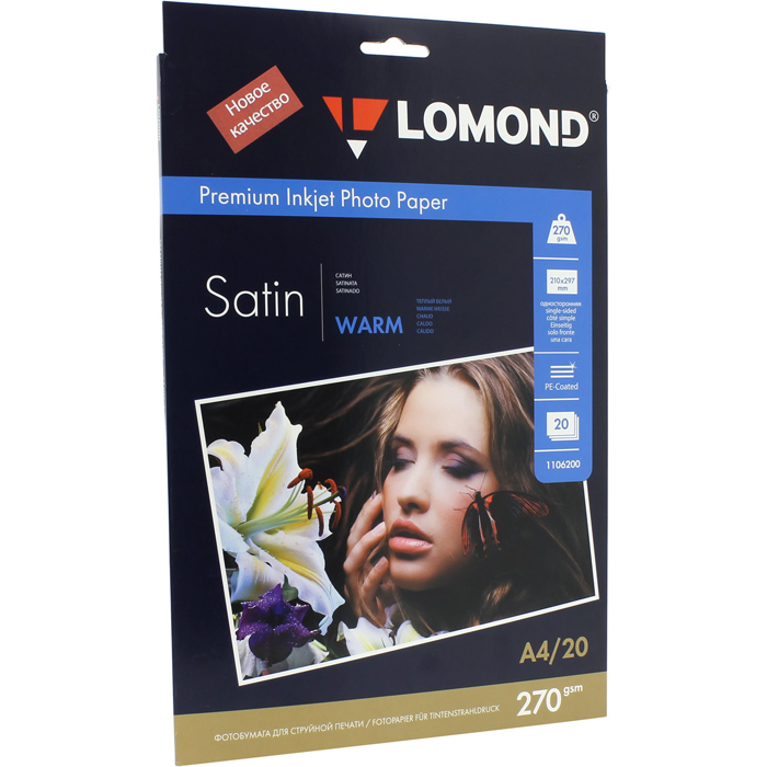 Фотобумага A4 270 г/м² сатин, 20 листов, односторонняя, Lomond 1106200 для струйной печати, Белый