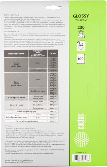 Фотобумага CACTUS Глянцевая A4 230 г/кв.м. 100 листов (CS-GA4230100)
