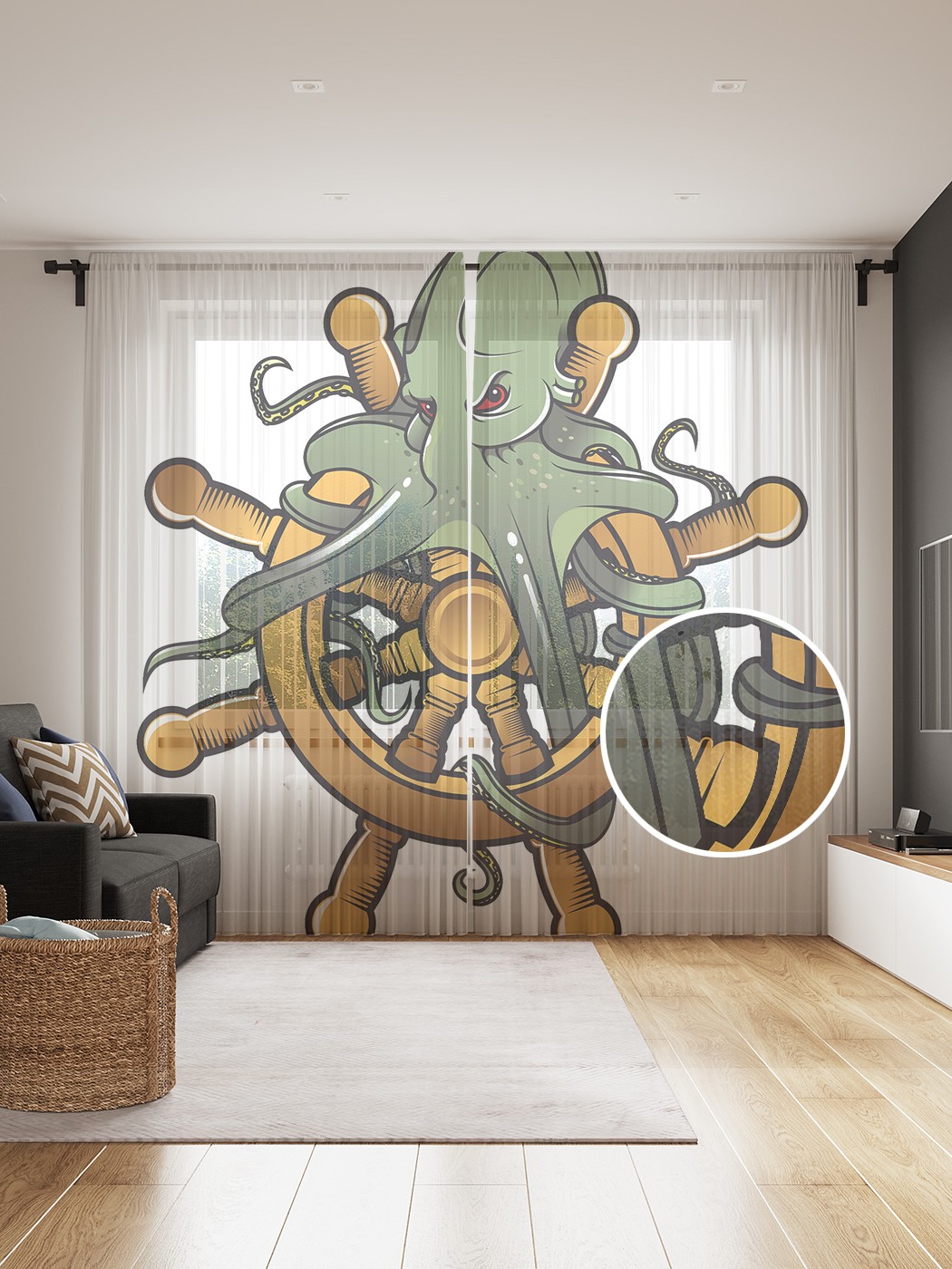Фототюль JoyArty "Осьминог за штурвалом", 145x265см, 2 полотна, лента, 50 крючков, Осьминог за штурвалом