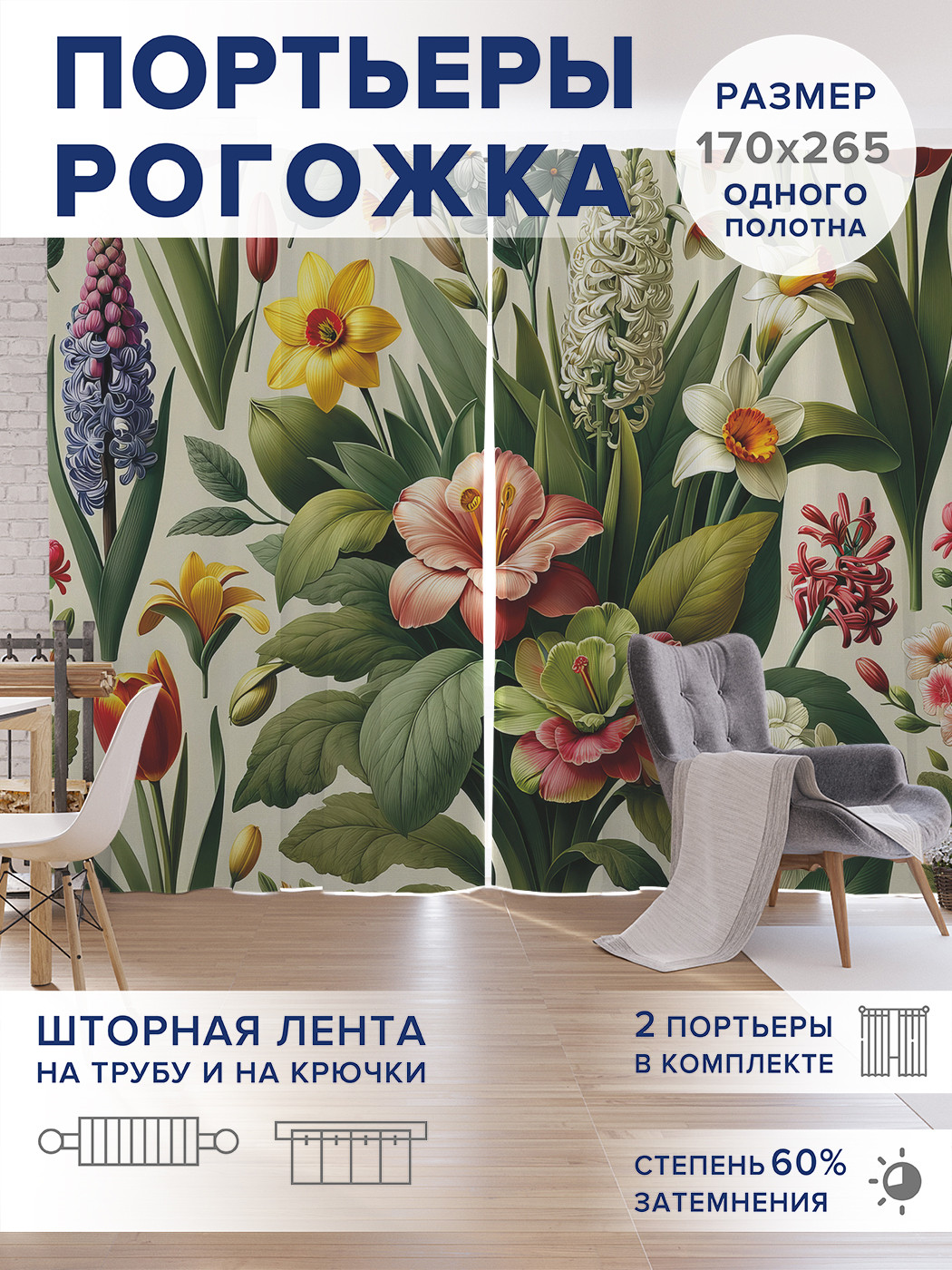 Длинные штор (2 полотна) шириной по 170 см и высотой 265 см изготовлены из высококачественного материала "Oxford" плотностью 200 гр./кв.м (100% полиэстер), фактура ткани рогожка. Изделие обработано водоотталкивающей пропиткой. Пластиковые крючки (50 шт.) Занавески можно повесить на карниз или трубу. Портьеры пропускают около 30% дневного света (не блекаут). Обратная сторона - белая. Изделие можно стирать при температуре 30-40 градусов, выбирая деликатный режим стирки. Яркость рисунка может отличаться от изображения на сайте. Допустимо отклонение в размерах +- 5 см.