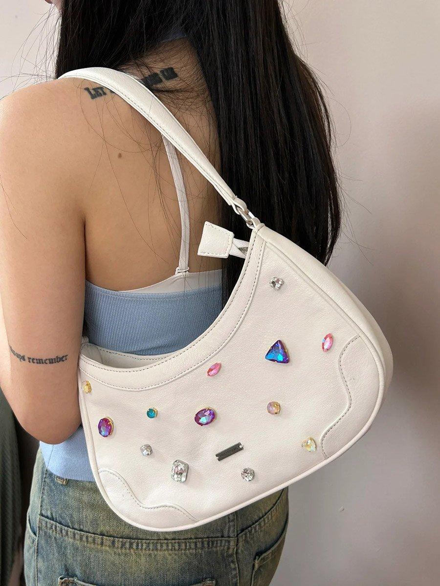 Французская премиальная цветная бриллиантовая драгоценность, черный бархат, нишевая кожаная сумка Spice Girl, сумка-багет через плечо 23*8*17 белый