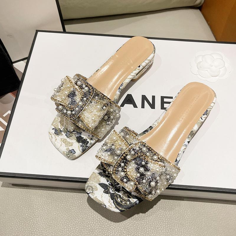 Французские крутые шлепанцы на толстом каблуке женские 2025 новая летняя модная обувь низкий каблук уличные шлепанцы со стразами 41