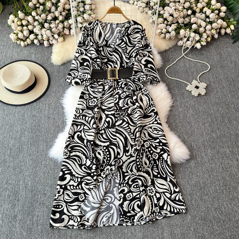 women elegant dress striped patchwork polka dot three quater lantern sleeve with waist belt lady fashion classy modest vestidos, Black;gray