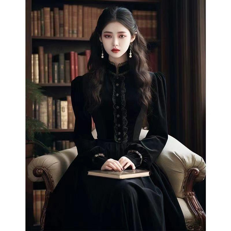 Французское ретро бархатное платье в стиле Хепберн черного цвета для женщин - Зимнее и осеннее платье-стойка, приталенного силуэта, маленькое черное платье. L