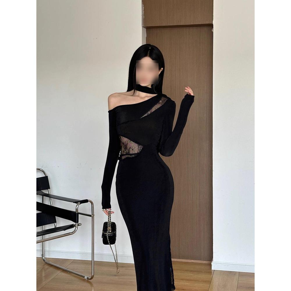 Французское ретро черное кружевное вечернее платье с открытыми плечами - Новая весенняя коллекция XL