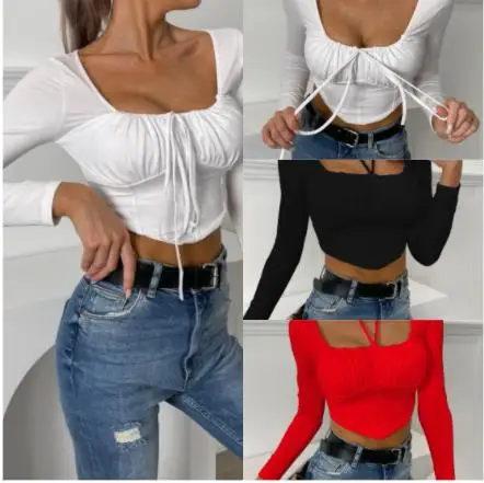 Футболка женская базовая с квадратным вырезом, повседневный элегантный облегающий Топ с длинным рукавом, однотонная пикантная уличная оде...