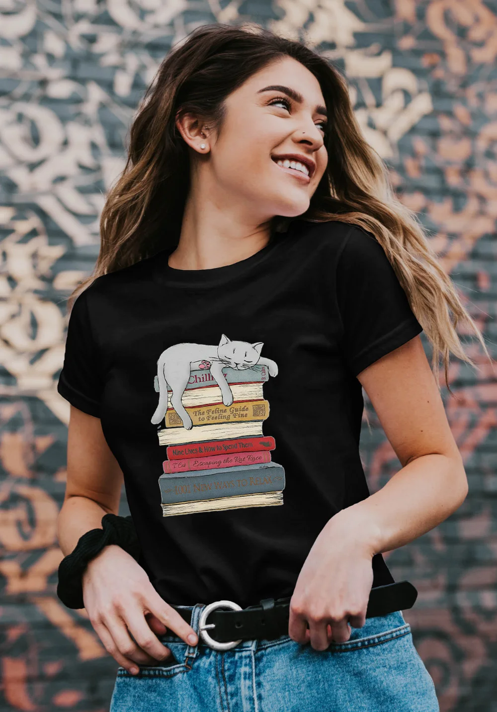 Футболка женская летняя с коротким рукавом и графическим принтом «Кот и книга»