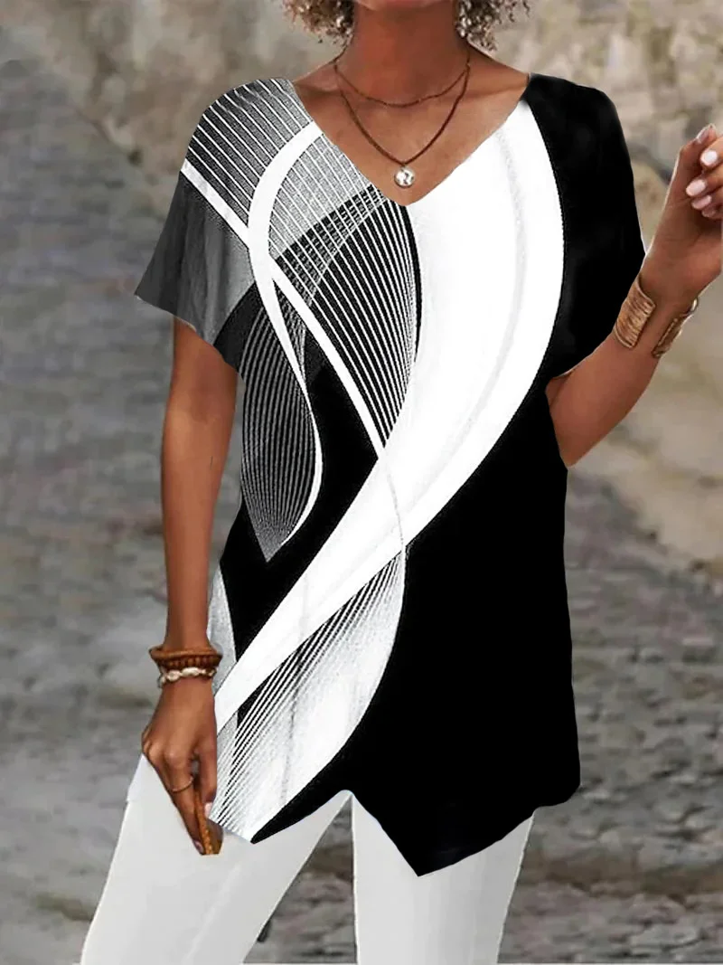 Футболка женская с геометрическим принтом, элегантный пуловер с асимметричным подолом, повседневный Свободный Топ с коротким рукавом и V-образным вырезом, 5XL, на лето