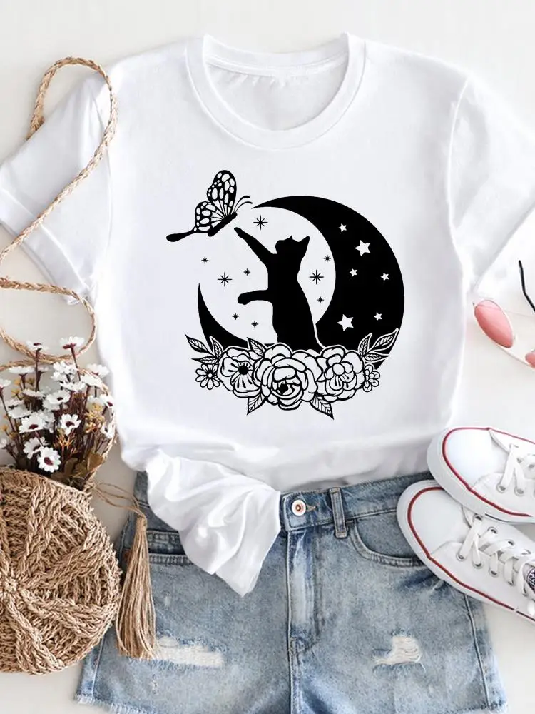 Футболка женская с графическим принтом, модный топ, повседневная одежда с принтом кота, Луны, милый тренд, с коротким рукавом, на лето