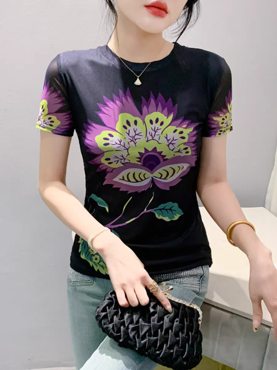 Футболка женская с коротким рукавом, круглым вырезом и цветочным принтом