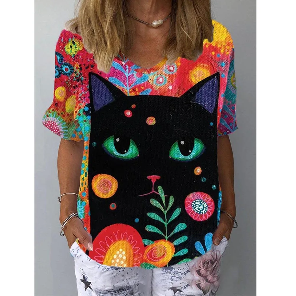 Футболка женская с принтом кошки, V-образным вырезом и коротким рукавом