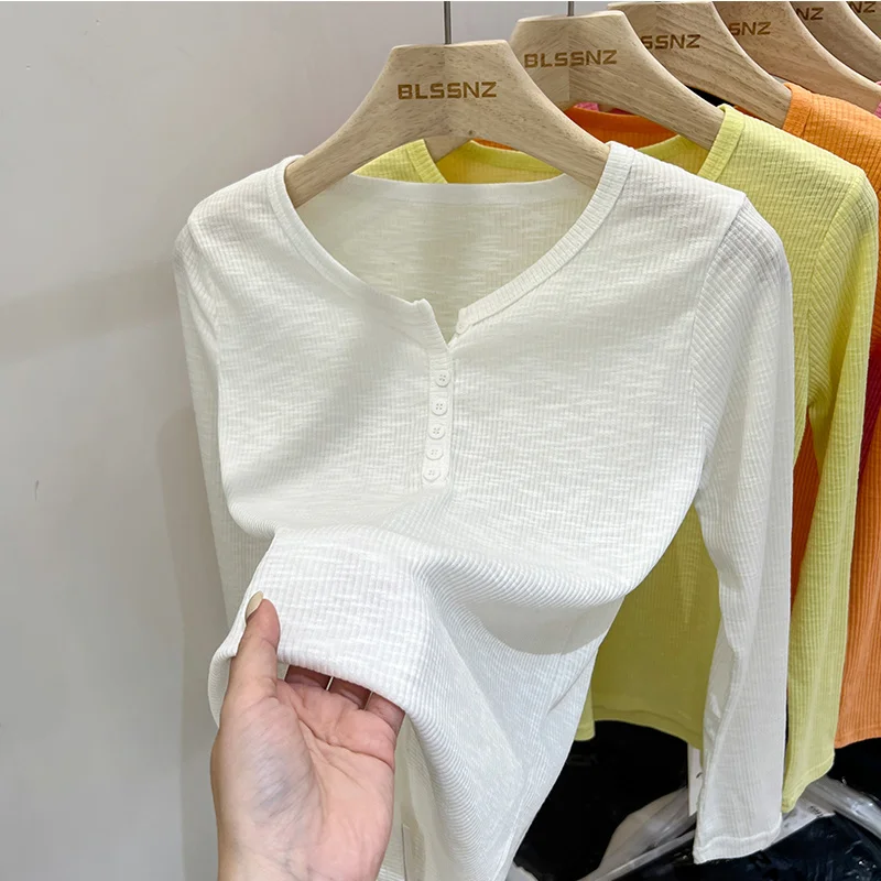 Футболка женская трикотажная на пуговицах с V-образным вырезом и длинным рукавом