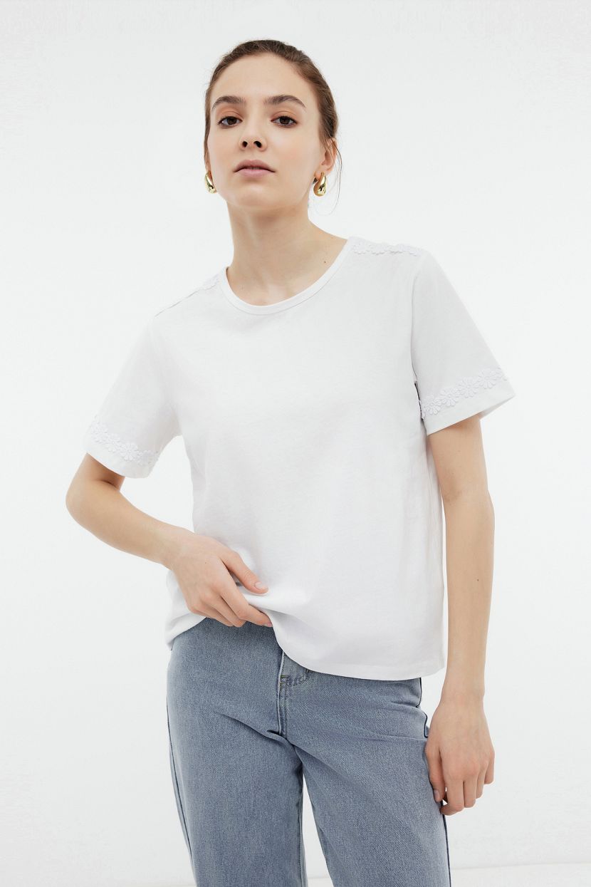 Футболка прямого силуэта из хлопкового джерси . Круглый вырез горловины ,отделка кружевной тесьмой по плечам и по низу рукавов.