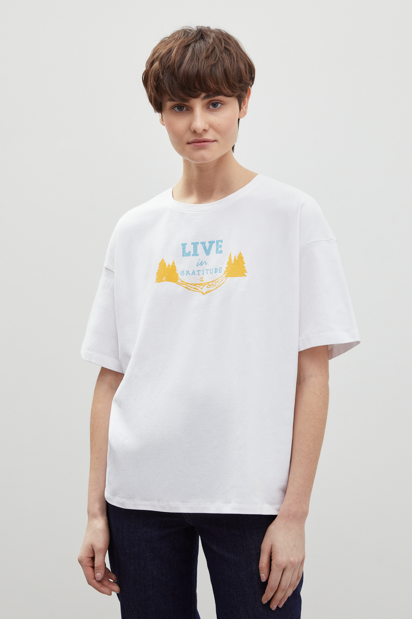 Лаконичная женская футболка из смесового хлопка. Плотная натуральная ткань хорошо держит форму, пропускает воздух и не электризуется. Небольшой процент эластана обеспечивает легкий стрейч-эффект и комфортную посадку. Модель прямого кроя с круглым вырезом, коротким рукавом и актуальным принтом на груди.