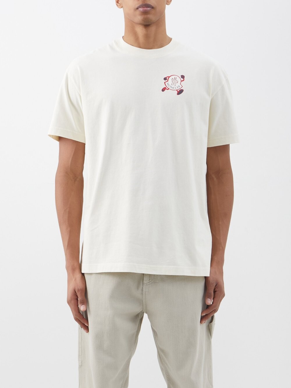 Кремовая футболка Moncler выполнена из хлопкового джерси свободного кроя и украшена причудливым мультяшным логотипом лейбла.