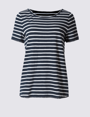 Футболка из чистого хлопка в полоску с кружевной каймой, Морской микс