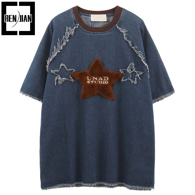 Футболка мужская оверсайз из джинсовой ткани, уличная одежда в стиле хип-хоп, свободный крой, мешковатая футболка с пушистой звездой, в стиле Харадзюку, Y2K