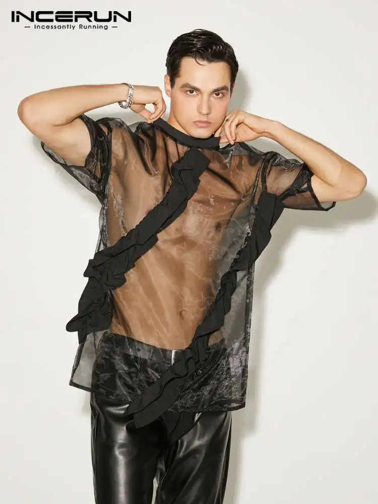 Футболка мужская сетчатая с круглым вырезом, коротким рукавом и оборками