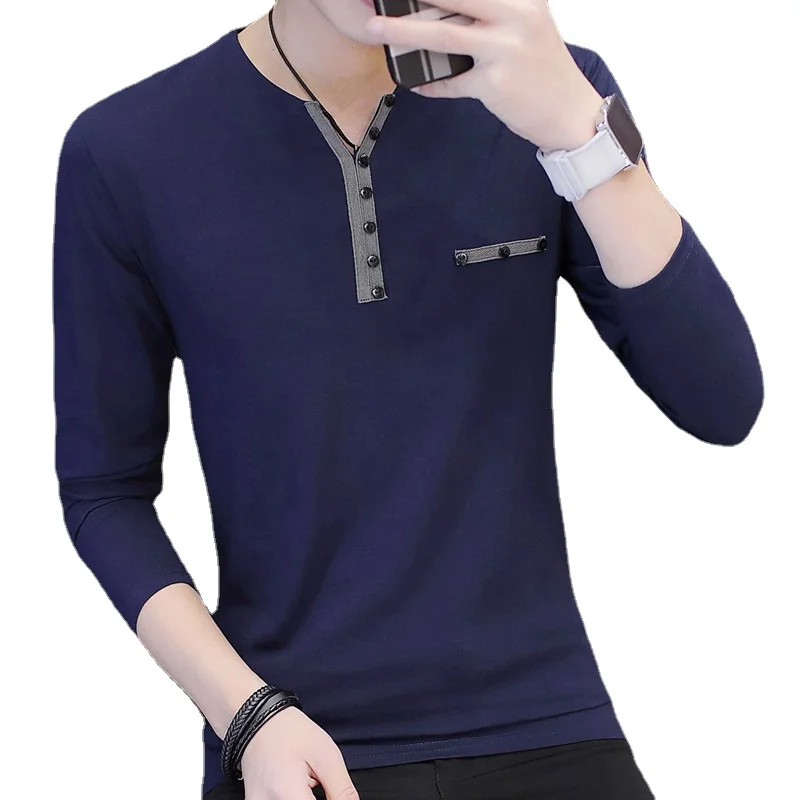 Футболка мужская с длинным рукавом, хлопок, пуговицы, v-образный вырез, повседневная одежда, осень-зима