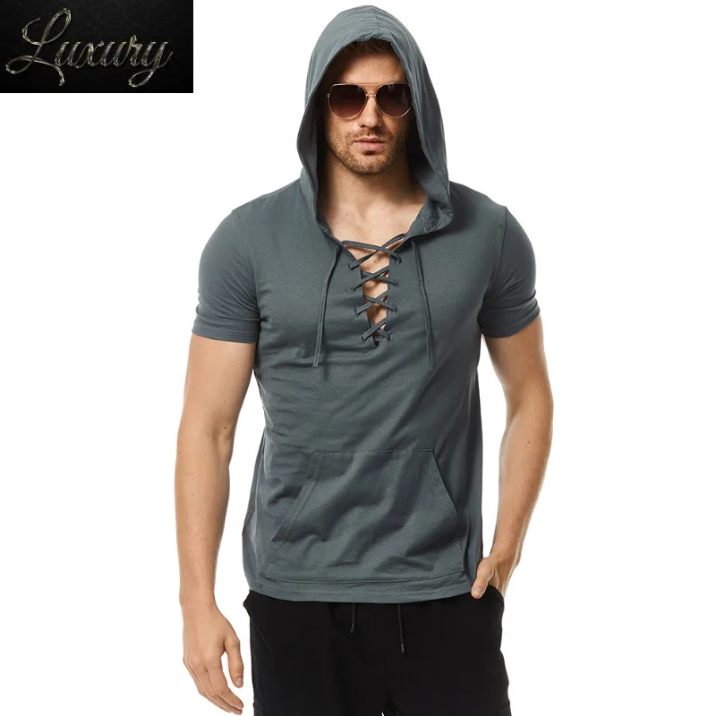 Футболка мужская с капюшоном, Повседневная тонкая мягкая легкая хлопковая футболка с коротким рукавом, однотонный спортивный топ для спортзала, пляжная одежда для фитнеса, лето