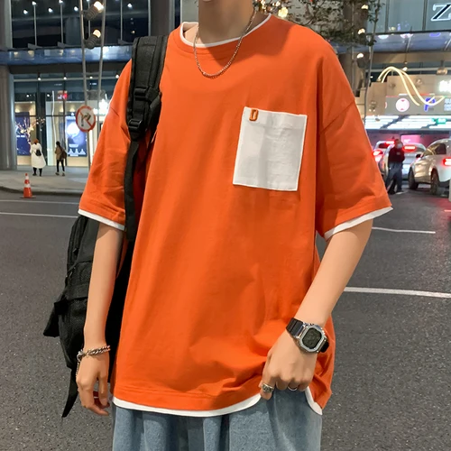 Футболка мужская с коротким рукавом, имитация двух предметов, в стиле пэчворк, с карманами, топ в стиле хип-хоп, простая уличная вышивка, корейская мода