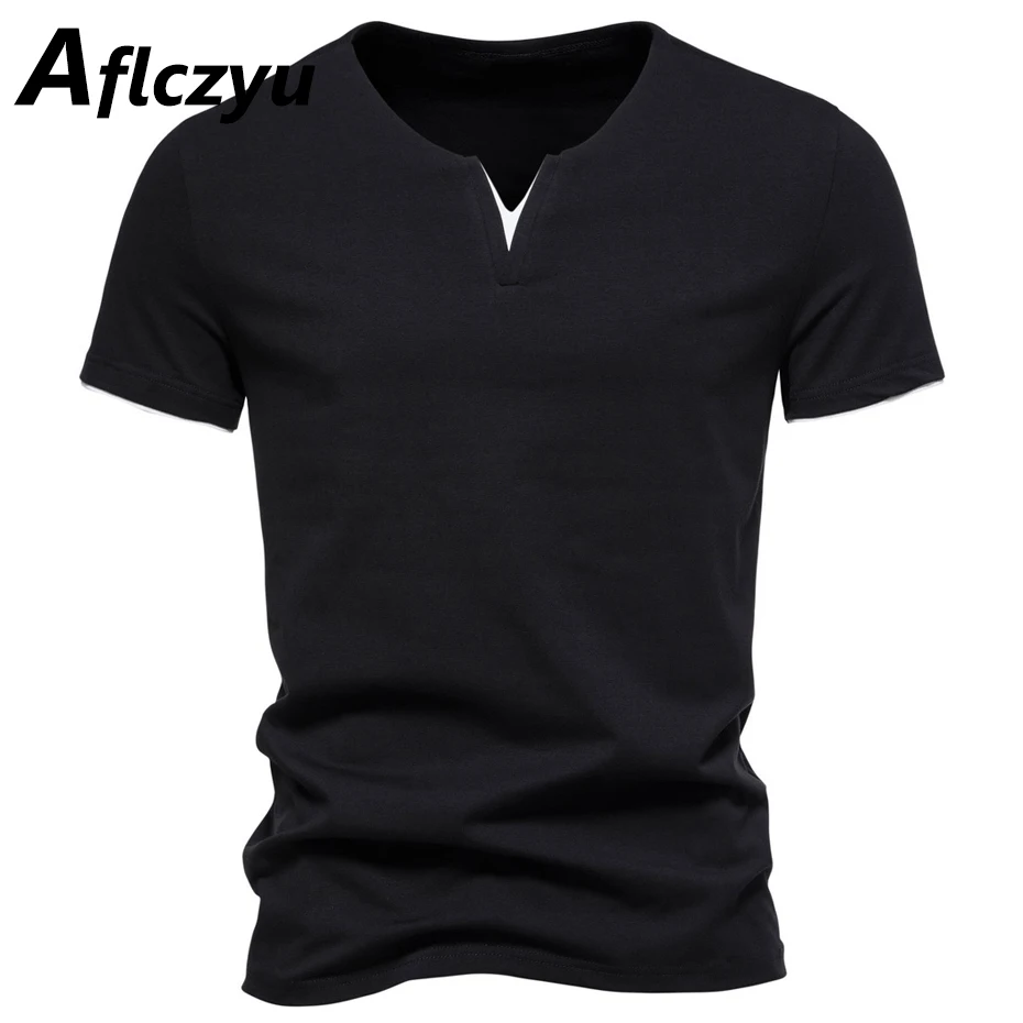 Футболка мужская с V-образным вырезом, модная повседневная тенниска с короткими рукавами, однотонная хлопковая майка, лето