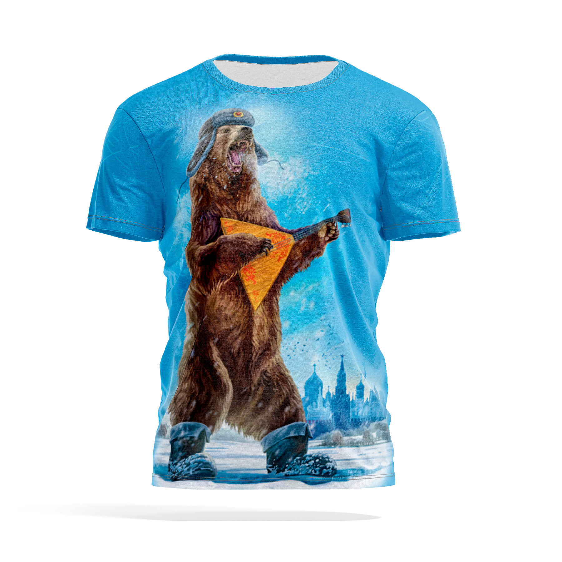Футболка PANiN Brand. Дышащая 3D футболка из 100% синтетического материала. Печать 3Д рисунка осуществляется методом сублимационной печати, что позволяет сохранить насыщенность и яркость рисунка даже после 100 стирок. Стирка при температуре до 40 градусов, в первую стирку не смешивать с белыми вещами. Принт стойкий, не отстирывается. Гладить можно по поверхности рисунка. Футболка станет отличным подарком мужчине на 23 февраля, День рождения или по любому поводу. Звери / Медведи Мишка с балалайкой
