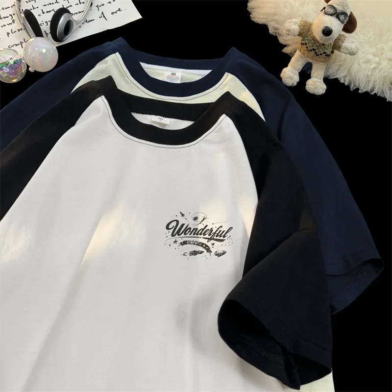 Футболка реглан из чистого хлопка с коротким рукавом и круглым вырезом, модная Универсальная футболка для пары