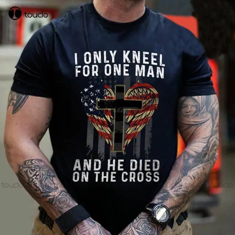 Футболка с американским флагом и надписью «Я только колени для одного человека, и он умер на кресте»
