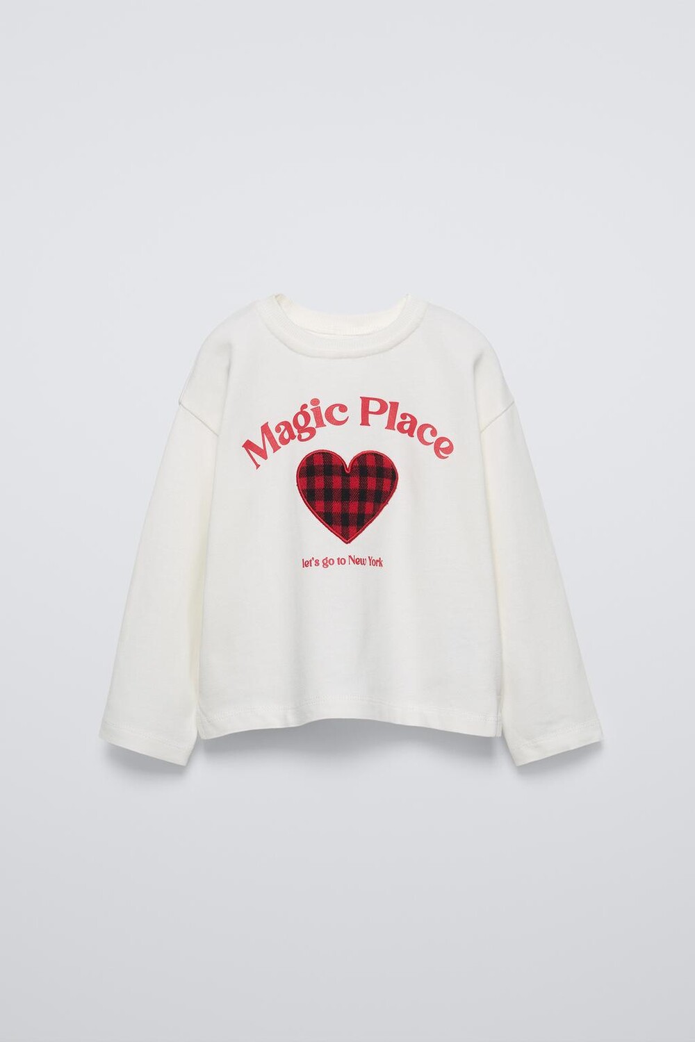 Футболка с длинным рукавом и круглым вырезом. Спереди сердечко, клетчатая ткань и текстовый принт.