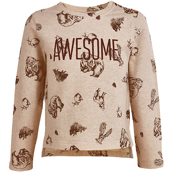Лонгслив для мальчика. Серый лонгслив с надписью и мелким рисунком в виде зверей, с мягким округлым горловым вырезом. Лонгслив с удлиненной спинкой сзади.
