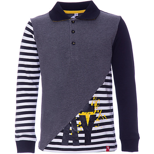 Футболка с длинным рукавом Play Today для мальчика. Футболка с длинным рукавом смотрится очень оригинально благодаря интересному сочетанию принтов и цветов. Серый, черный и белый – классика, которая не может не нравиться. Желтое цветовое пятно в виде водного принта оживляет модель. Натуральная ткань, удобная застежка, мягкий воротник, немаркий цвет.