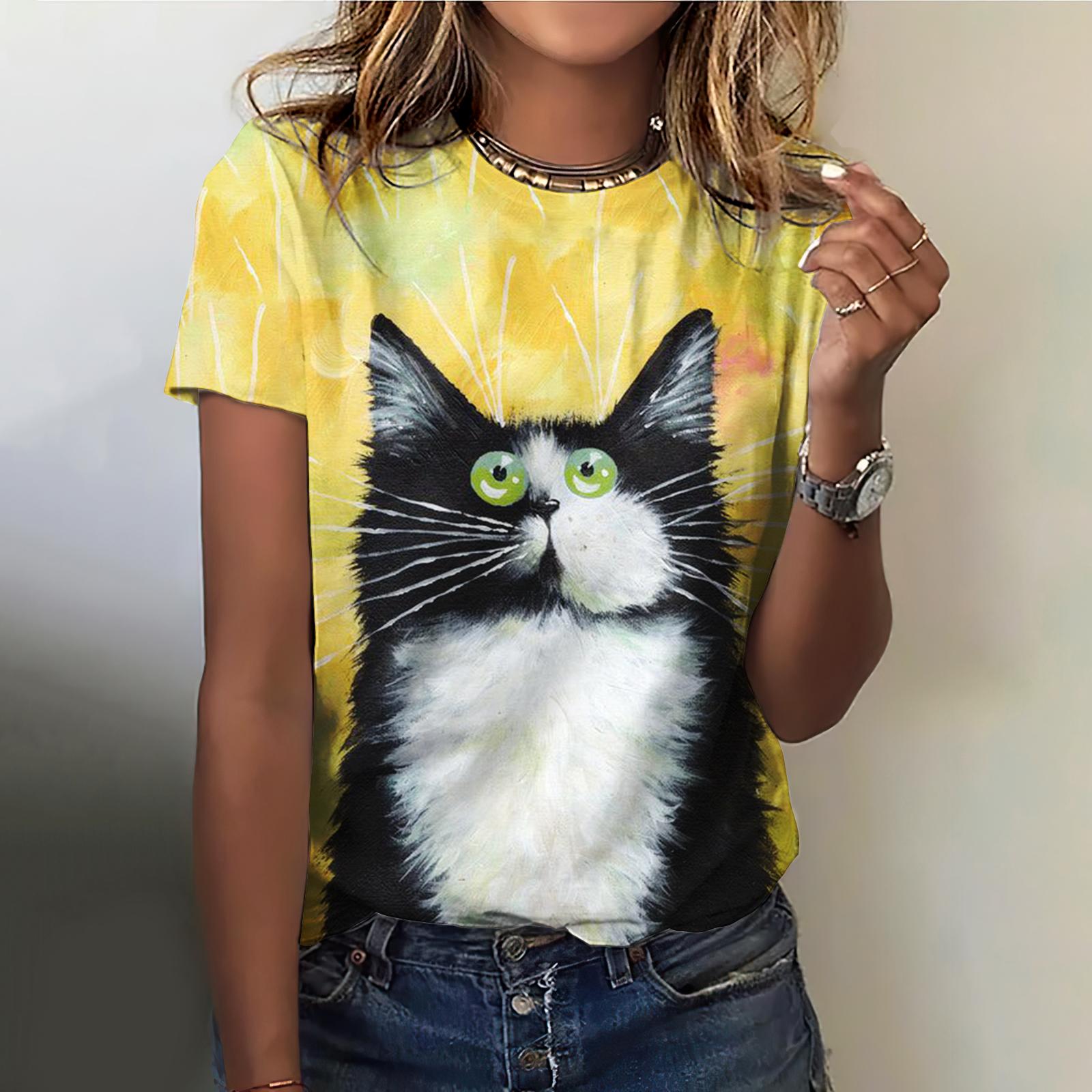Футболка с забавным рисунком кошки для женщин, милые футболки с 3D-принтом в виде животных, летние модные футболки больших размеров с короткими рукавами и круглым вырезом 6XL
