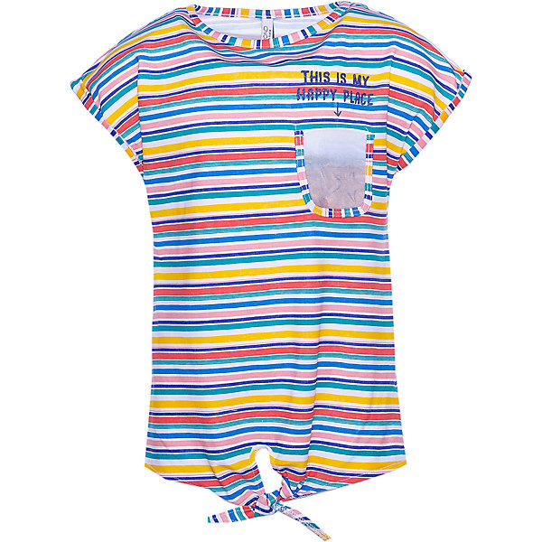 Футболка классического кроя. Круглая горловина отделана кантом. Рукава дополнены отворотами. Украшена узором в разноцветную полоску и надписью на груди. Внизу завязки. Хорошо пропускает воздух. Обеспечивает комфортную посадку.
