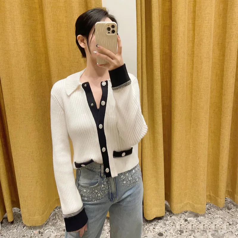 Новинка Осень-зима 2023 модный дизайн короткий тонкий трикотажный топ с отворотом и длинными рукавами