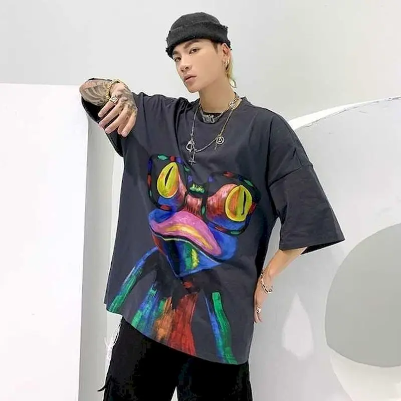 Футболка с ручной росписью, Рисунок маслом, граффити, принт лягушки, Национальный оверсайз, свободная футболка для влюбленных в стиле хип-хо...