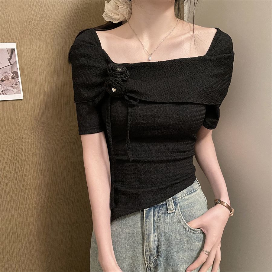 Футболка с французским квадратным воротником и бантом, трехмерный цветочный галстук, женская летняя футболка с открытыми ключицами L чёрный