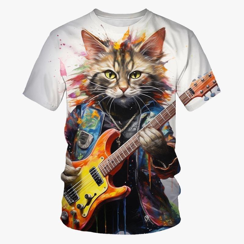 Футболка с 3d принтом гитары, баса и кота для мужчин, футболка с рисунком животных, хип-хоп, индивидуальные футболки с короткими рукавами и круглым вырезом, рок-футболки 5XL